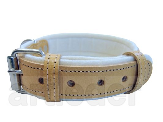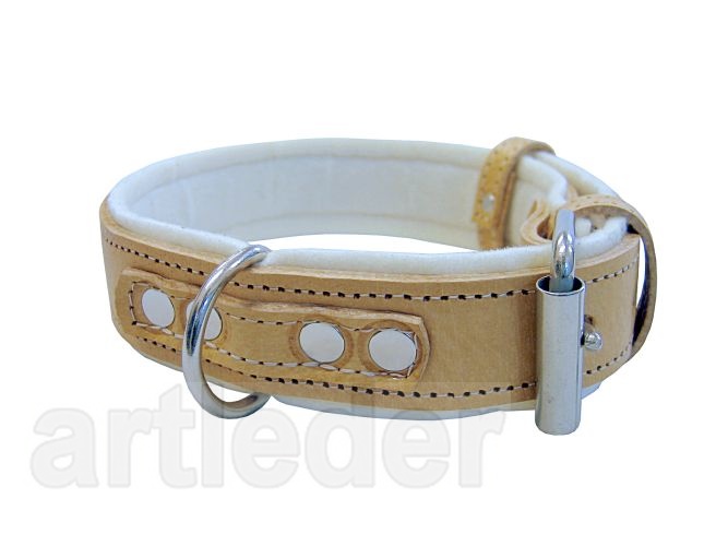 Dwie warstwy skóry plus materiał chemoutwardzany wewnątrz oraz podbicie dają mocną i wytrzymałą obrożę. Warstwy są sklejone i przeszyte.