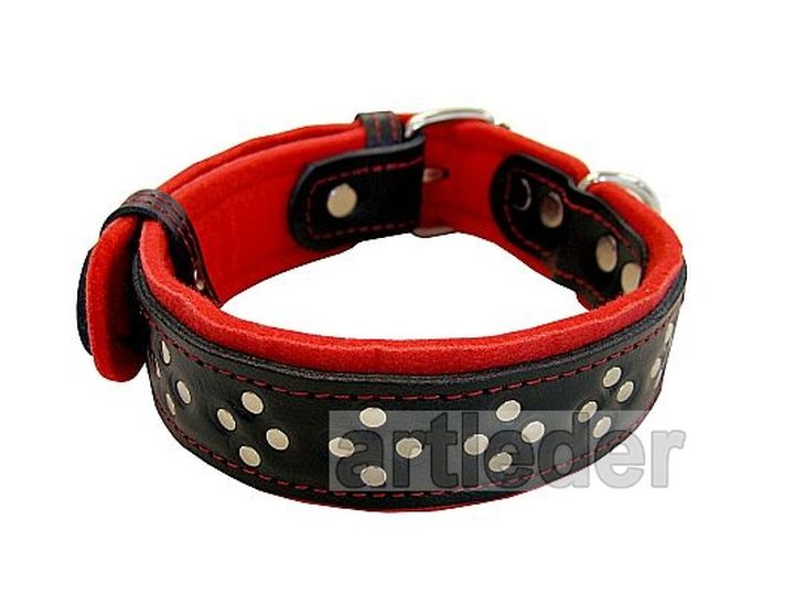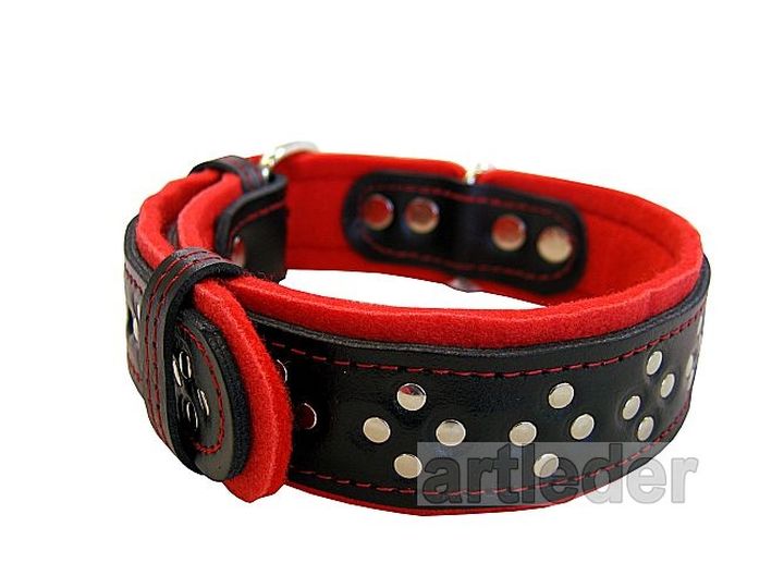 Dwie warstwy skóry plus materiał chemoutwardzany wewnątrz oraz podbicie dają mocną i wytrzymałą obrożę. Warstwy są sklejone i przeszyte.