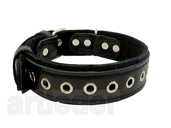 Dwie warstwy skóry plus materiał chemoutwardzany wewnątrz oraz podbicie dają mocną i wytrzymałą obrożę. Warstwy są sklejone i przeszyte.